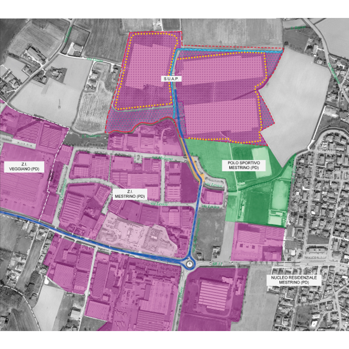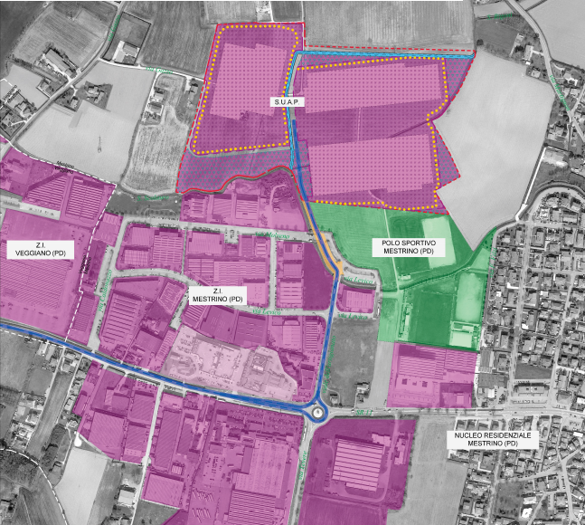 L’area oggetto di intervento proposta ricade a ridosso delle zone industriali dei comuni di Veggiano (PD) e Mestrino (PD). L’area di superficie territoriale pari a 178.000 mq interamente compresa nel comune di Mestrino (PD), è stata frazionata in due ampi lotti, denominati «A», «B», per i quali è stato redatto un progetto che, tramite procedura di sportello unico (art.4 LR 55/2012), prevede la costruzione di tre fabbricati stand alone ad uso industriale/artigianale/logistico, delle seguenti dimensioni: