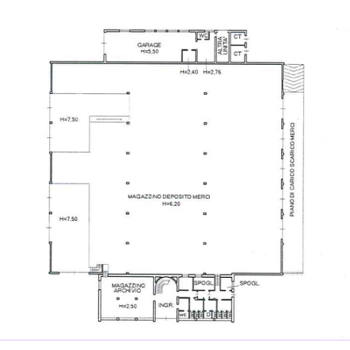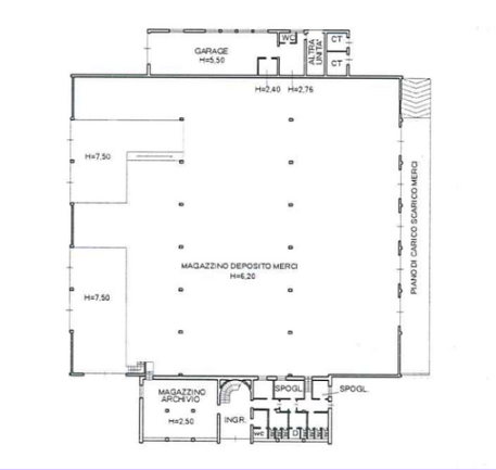 L’interno del capannone è su due quote distinte, ovvero 6.50 mt quota rialzata e principale, quota 7.50 quota piazzale / parcheggi.